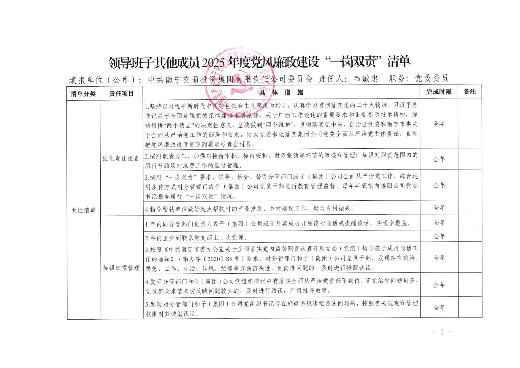 南寧交投集團領(lǐng)導(dǎo)班子其他成員2025年度黨風(fēng)廉政建設(shè)“一崗雙責(zé)”清單(七)